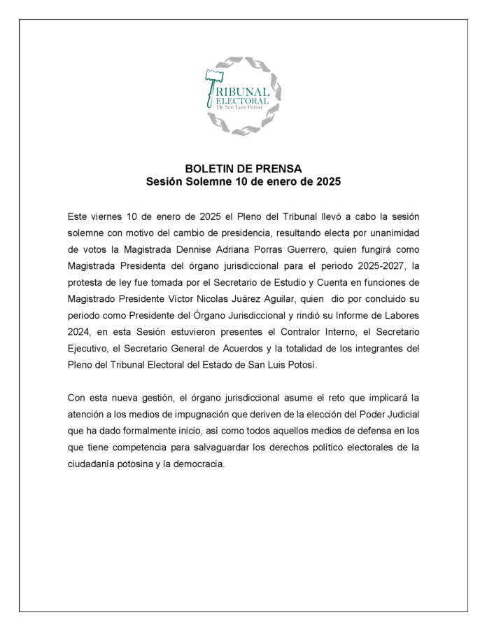 En el comunicado también se detalla que el órgano jurisdiccional asumirá “el reto que implicará la atención a los medios de impugnación que deriven de la elección del Poder Judicial que ha dado formalmente inicio, así como todos aquellos medios de defensa en los que tiene competencia para salvaguardar los derechos político electorales de la ciudadanía potosina y la democracia”.